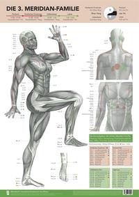 3 Lehrtafeln, laminiert, Maße: 29,5 x 42 cm, Die 1. Meridian-Familie, Lunge, Dickdarm, Magen, Milz/Die 2. Meridian-Familie, Herz, Dünndarm, Blase, Niere/Die 3. Meridian-Familie, Perikard, Dreifacher Erwärmer, Gallenblase, Leber